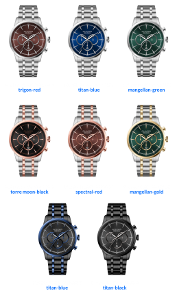 Neuartige Ionen Beschichtungen mit Metallic Effekt / Zifferblätter mit Radialschliff mit einer außergewöhnlichen Tiefenwirkung versehen sowie spezielle Ausführungen in Titan runden das Erscheinungsbild dieses neuartigen M.A Chronographen ab.