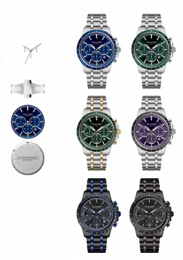 Stoppfunktionen, Telemeter Skala, Datumfenster rund bei 4/5 abgewinkelt mit schwarzer Keramik Scheibe. Totalisatoren: 316L hochglanzpoliert
